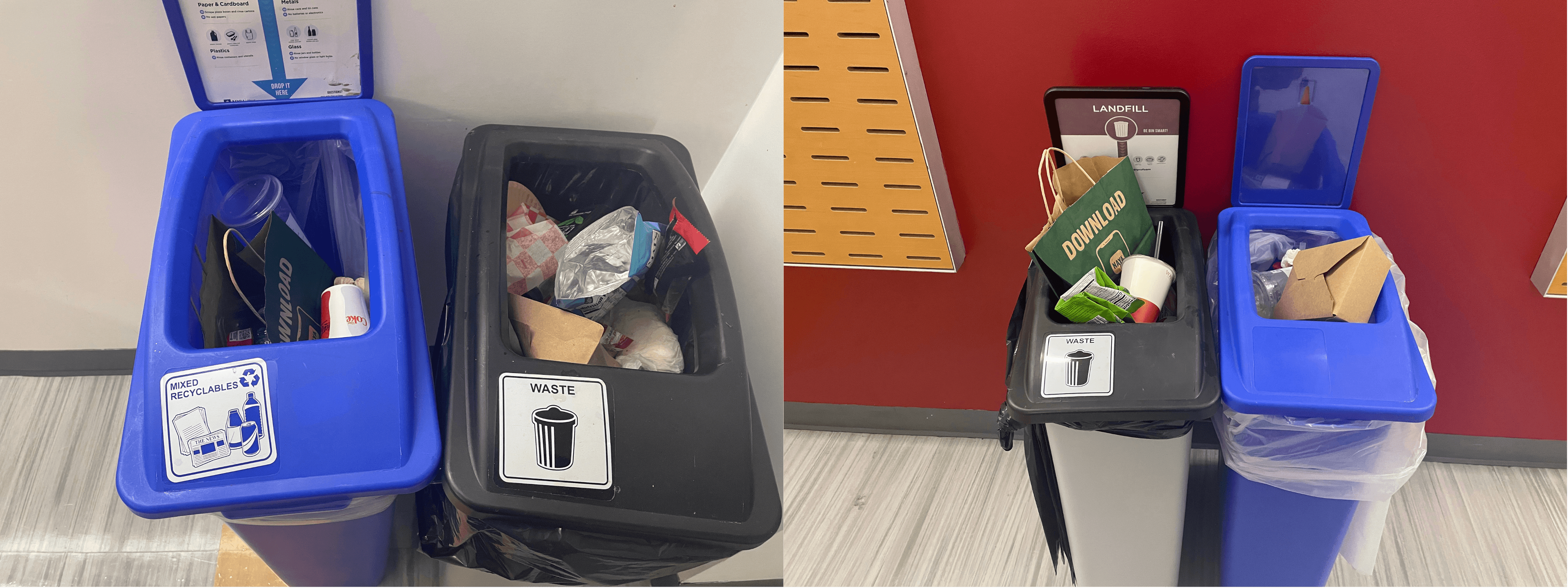 These images were taken from disposal stations around NYU. Labels are missing, recyclables are misplaced and the landfill bin is overflowing with recyclables