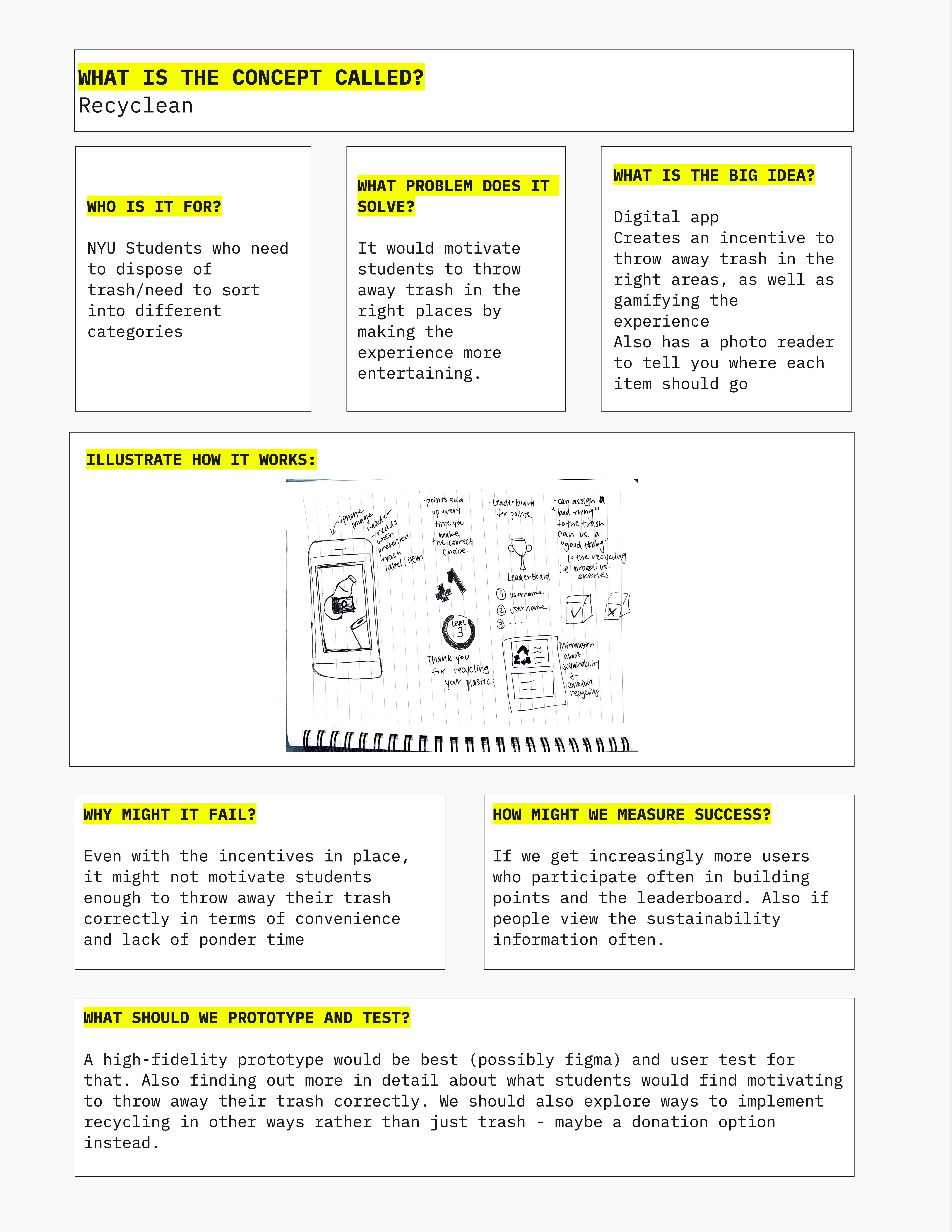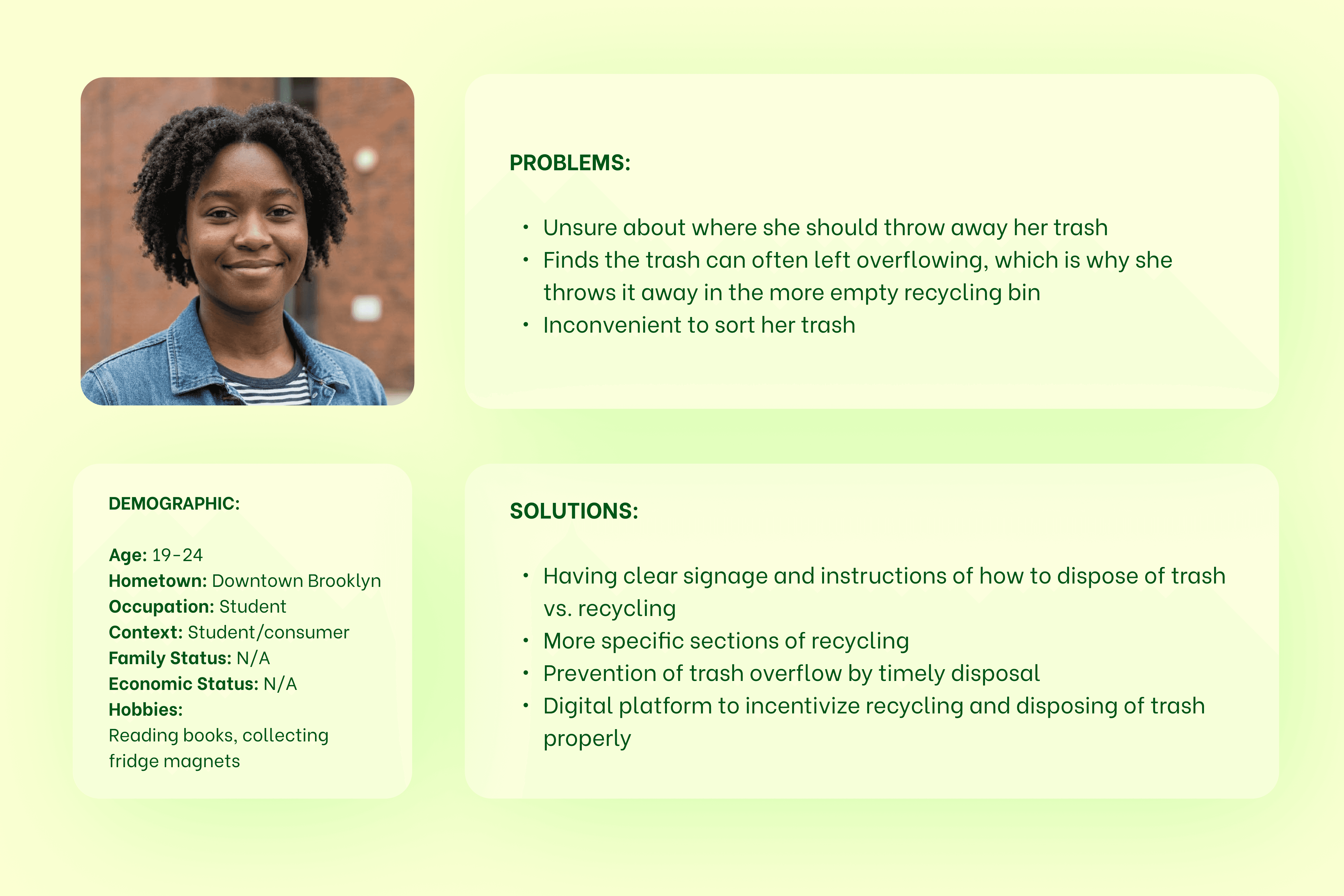 An Empathy map helped me understand user perspectives to ultimately create a user centered solution. The map represents what an NYU student says, thinks, does and feels about recycling on campus: